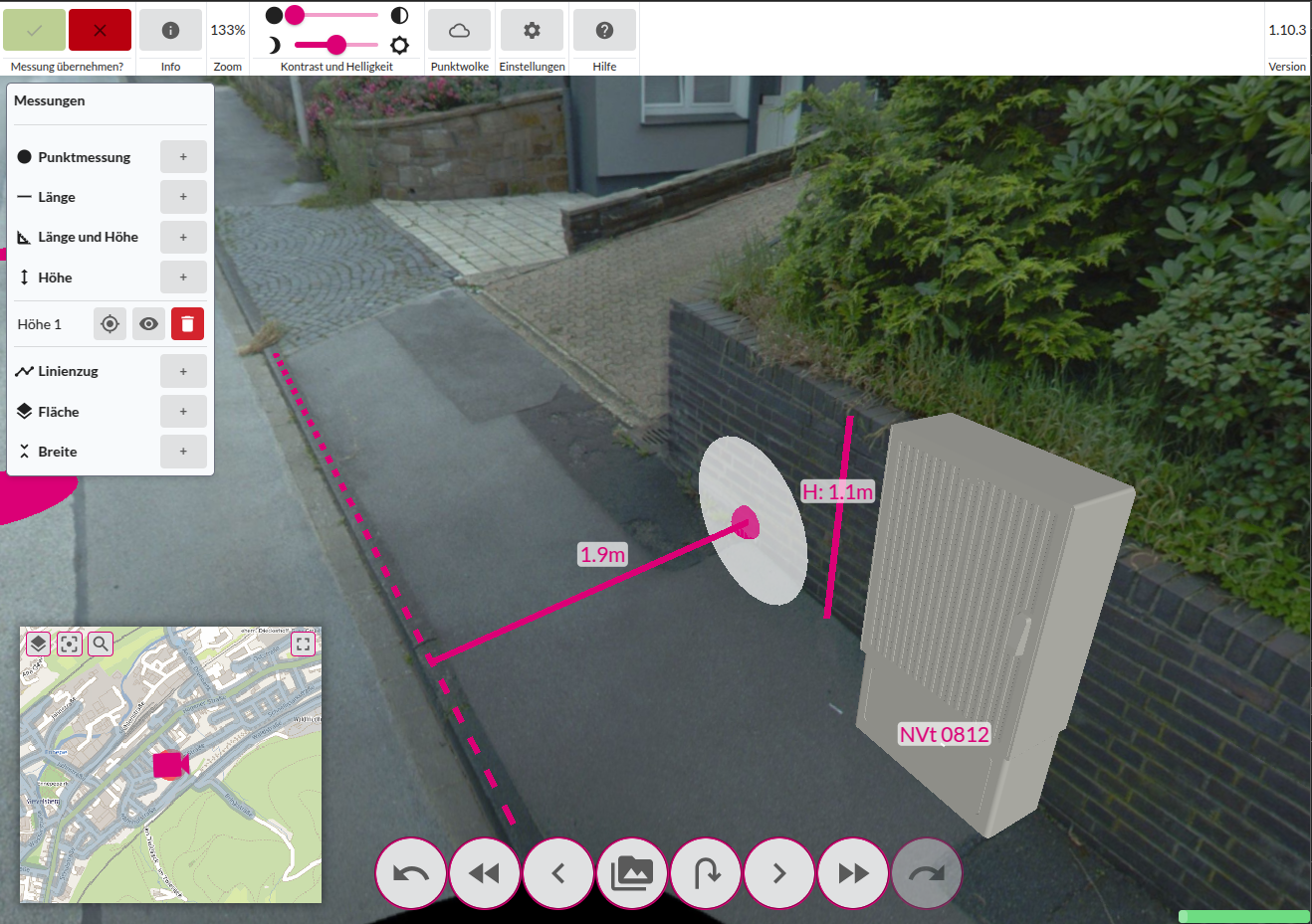 Ein kleines, aber entscheidendes Detail ließ sich bisher aber nicht vom Schreibtisch aus planen, sondern erforderte stets Vor-Ort-Begehungen und Ausmessungen: die Bestimmung der Position der Netzverteilerkästen, die die einzelnen Glasfaserleitungen von der Haupttrasse an die Haushalte verteilen. Zeitaufwändige Vor-Ort-Termine der Planer waren die einzige Lösung, um einen geeigneten Standort zu finden. Unsere Software Fibre3D stellt dafür nun eine interaktive 3D-Visualisierung der Ausbaugebiete auf Basis der Panoramabilder und Punktwolken zur Verfügung. Fibre3D ermöglicht den Planern, in eine 3D-Welt einzutauchen, die Kästen virtuell zu positionieren und so vom Schreibtisch aus dem am besten geeigneten Standort zu finden. Messfunktionen und maßstabsgetreue Projektionen ermöglichen auch bei technisch anspruchsvollen Lokationen eine zügige Prüfung. Die Integration zusätzlicher Informationen wie die Position von Tiefbautrassen erleichtern die Bewertung verschiedener Trassenverläufe. Ist die digitale Planung abgeschlossen, können direkt aus dem Tool heraus anschauliche Fotomontagen für die Antragsunterlagen zur Standortsicherung generiert werden. Dieser realistische Eindruck erleichtert auch dem Wegeunterhaltspflichtigen den Genehmigungsprozess.