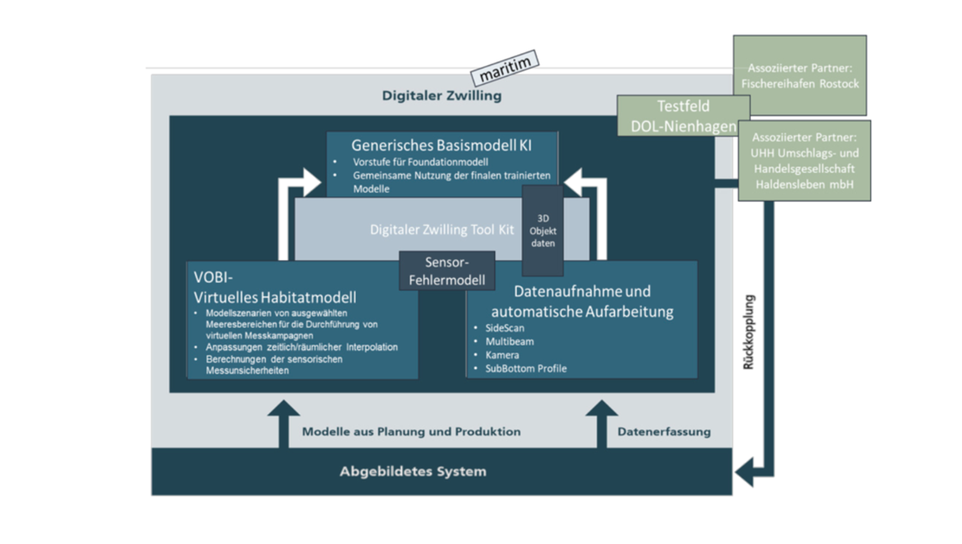 Das Projekt OTC-DaTA2Model verfolgt die Entwicklung eines generischen KI-Basismodells sowie eines modularen Digitalen Zwillings für die maritime Branche. Unter der Leitung des Fraunhofer IGD Rostock und in enger Zusammenarbeit mit führenden Partnern aus Wissenschaft und Industrie adressiert das Vorhaben zentrale Herausforderungen bei der effizienten Nutzung und Analyse heterogener Sensordaten im Unterwasserbereich. Die Ergebnisse schaffen die Grundlage für innovative Anwendungen, von der Objekterkennung bis zur nachhaltigen Überwachung maritimer Infrastrukturen, und stärken die digitale Transformation im Ocean Technology Campus Rostock.
