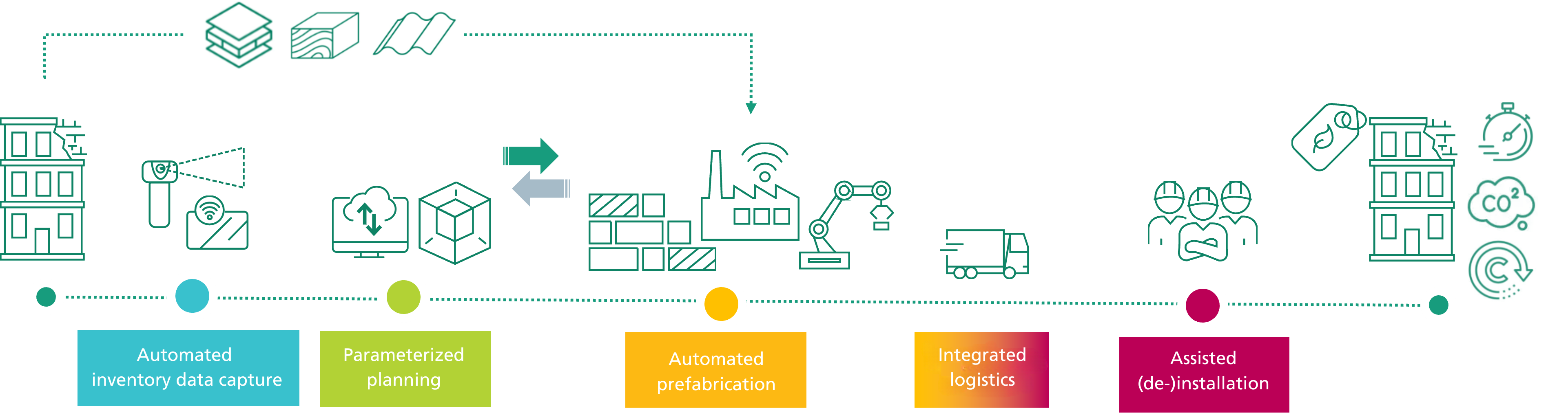 BAU-DNS focuses on three key approaches: the seamless use of digital data, sustainable processes throughout the entire life cycle, and systemic manufacturing that helps counteract the shortage of skilled workers. The construction process is consistently designed from the end backwards—from deconstruction and recycling to the reuse of regional and recycled materials.